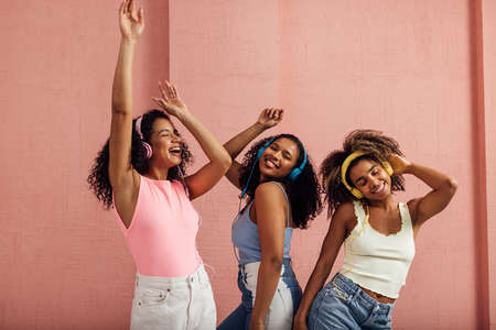 Group of three female friends leaning pink wall wearing bright casual clothes