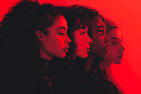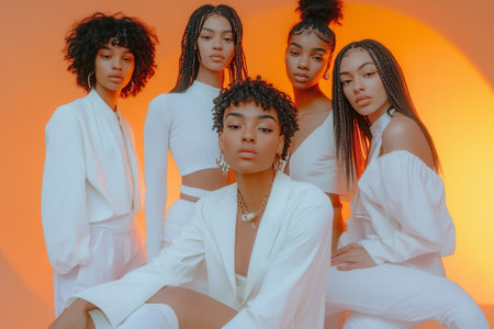 A diverse group of women, including Caucasian, Asian, and African American, stand gracefully together against an orange studio backdrop.