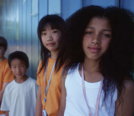 Mixed race international happy kids girls friends in jeans and white t-shirts walk together hugging laughing