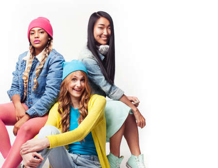 diverse multi nation girls group, teenage friends company cheerful having fun, happy smiling, cute posing isolated on white background, lifestyle people concept, african-american, asian and caucasian