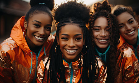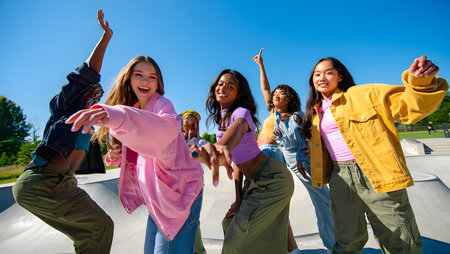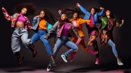 A vibrant photorealistic image showcasing a diverse group of young individuals expressing their unique styles and joy. Perfect for themes of youth culture and friendship.