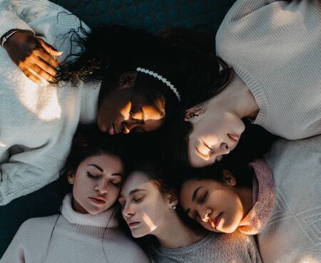 The portrait of multiracial group from five women with sunlit areas and shade patches. The concept of friendship and unity between different human races. Top view.