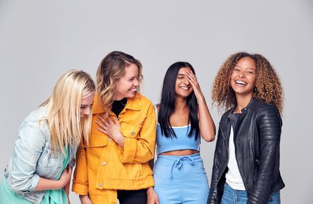 Group Studio Portrait Of Multi-Cultural Female Friends Smiling Into Camera Together