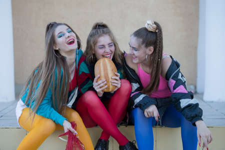 Beautiful country girls dressed in the style of the nineties are eating a roll and laughing.