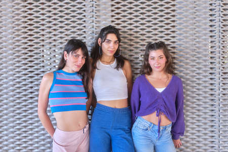 Three young women look at the camera posing seriously, committed against sexist violence.