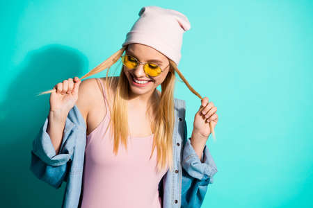 Close-up portrait of her she nice-looking attractive lovely lovable fashionable cute sweet cheerful cheery girl having fun isolated on bright vivid shine blue green turquoise background