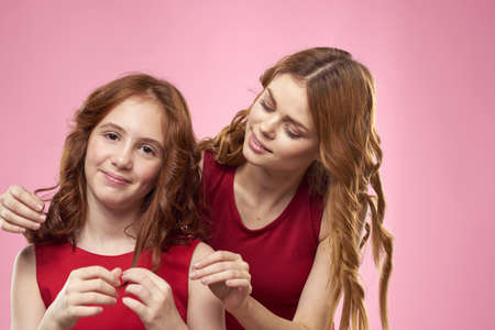 Cheerful mom and daughter wearing red dresses are standing next to joy family on pink background