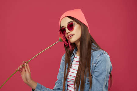 gorgeous brunette in pink hat red flower luxury isolated background