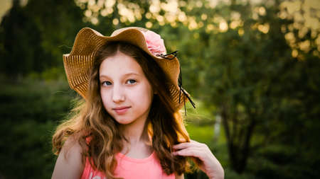Happy teenage girl in a hat in the light of the setting sun. Close-up of a girls face in the park. The child smiles at the camera. Face close-up. Happy child in the park. Beautiful face