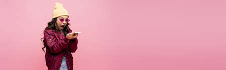 angry preteen girl in stylish outfit and sunglasses looking at smartphone and screaming isolated on pink, banner