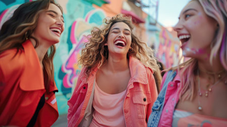 A vibrant outdoor celebration featuring three joyful friends laughing together amidst colorful confetti, capturing the essence of happiness, friendship, and festive spirit.