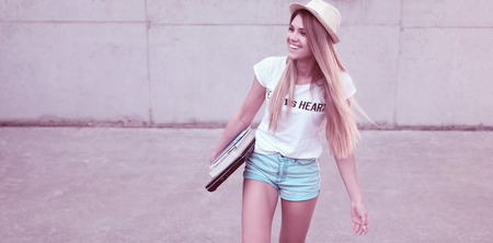 Attractive trendy young female student walking along with the books happy