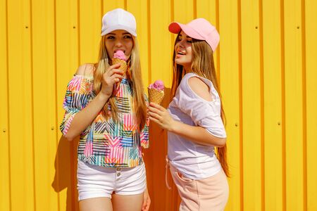Lifestyle portrait of two beautiful best friend hipster lady wearing stylish bright outfits and having great time. Standing near yellow wall enjoying day off and eating sweet cold ice-cream.