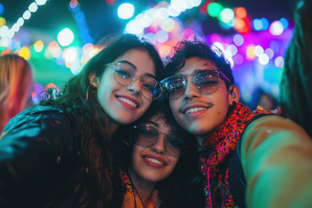 Three friends share a warm moment at a vibrant event smiling and enjoying each others company amidst colorful lights and lively music.