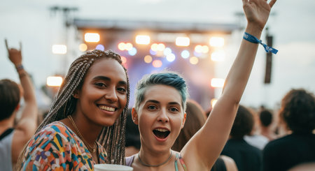 Beautiful young women having fun at colourful music festival. Happy girls enjoying themselves and dancing. Summer holiday, vacation concept. Generative AI.
