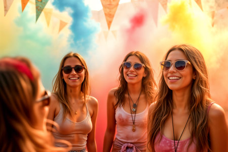 A joyful group of young women celebrating at a festival. Vibrant powder fills the air, with sunlight enhancing the glow. Flags in the background add to the energetic and dynamic atmosphere.