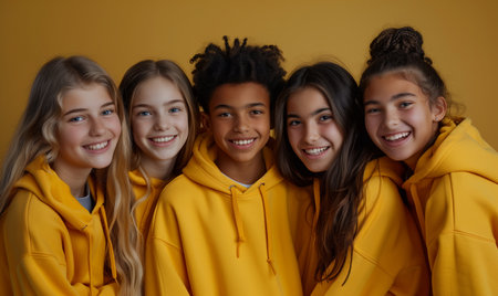 Group of happy interracial teenage schoolboys and girls in yellow monotonous mock-up sweatshirts on yellow background