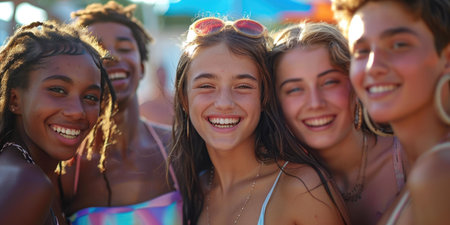A group of young women, best friends, sharing a joyful moment as they laugh together. Their faces are filled with happiness and camaraderie, showcasing the strong bond between them.
