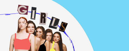 girls party. Contemporary collage with group of stylish women over background with lettering. Concept of female rights, diversity, emotions, extraordinary fashion, modern style, ad