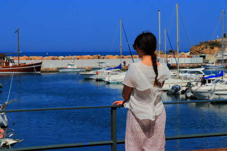 young woman alone discovering a Mediterranean port, Port Vendre in Pyrenees orientales, France