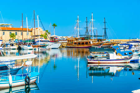 Paphos Cyprus March 01, 2020 View of boats moored in the harbour of Paphos in the afternoon