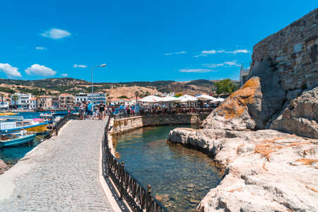 IZMIR, TURKEY - JUNE 05, 2019 : Fishing boats in touristic place of Aegean Region in Phocaea Town with old and historical, traditional architecture buildings. Phocaea is ancient city in old dates.