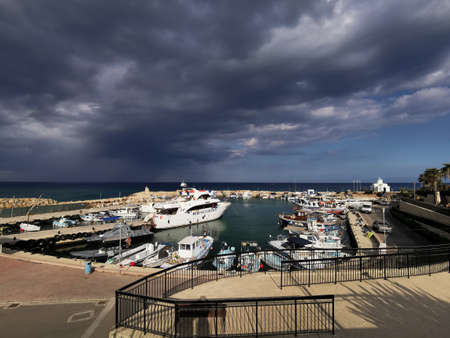Protaras. Cyprus. Pier, port with small ships, yachts and boats in the bay of the Mediterranean Sea against the backdrop of a dramatic sky.