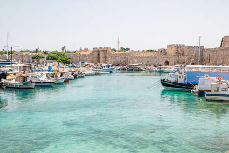 Rhodes, Greece - June 2021: Boats in the port of Rhodes.