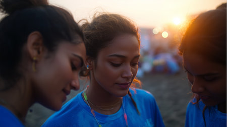 Friends sharing a moment on the beach during sunset while wearing matching blue shirts and enjoying their time together