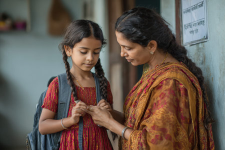 Caring Indian mother helps daughter prepare for school in a warm, inviting home environment, showcasing the bond between parent and child during morning routines
