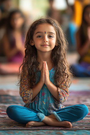 A young girl sits cross-legged on a patterned mat with her hands pressed together in a gesture of prayer. She wears vibrant clothing and has long, curly hair. The atmosphere around her is calm, filled with other children engaged in meditation.