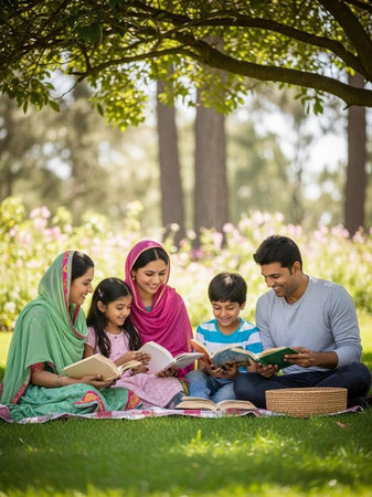 Two children sit engaged in reading vibrant storybooks beneath a lush tree, enjoying a peaceful moment filled with imagination and wonder.