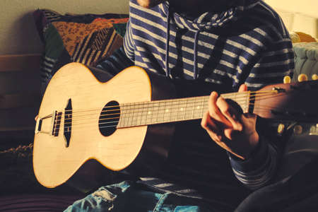 Guitarist with guitar playing at home. Unrecognizable male rehearsing at house, hobby for hipster, music concept
