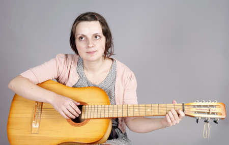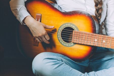 A girl plays a wooden guitar, close-up. Playing the guitar. Guitar in hand