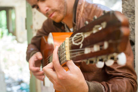 Sound music passion talent concept. Person playing on guitar. Man leaning on wall while playing on instrument,