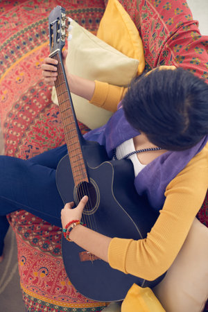 Stay Home Stay Safe. Young woman sitting at home and playing guitar, hands close up. Teen girl learning to play song and writing music. Hobby lifestyle relax Instrument leisure education concept