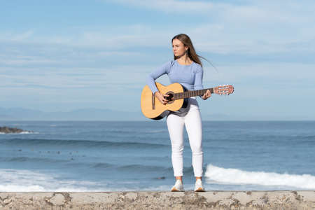 Portrait of pretty young woman playing guitar outdoors at the coastline, with copy space in the sky.