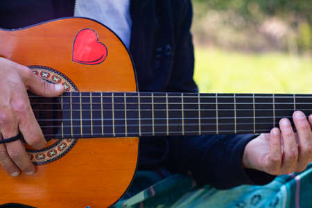 Guitars acoustic. Live music. Music festival. Male musician playing guitar, music instrument. Mans hands playing acoustic guitar, close up. Acoustic guitars playing. Music concept