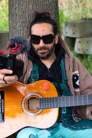 Hippy man with beard and glasses playing guitar making a video herself outdoors on the grass