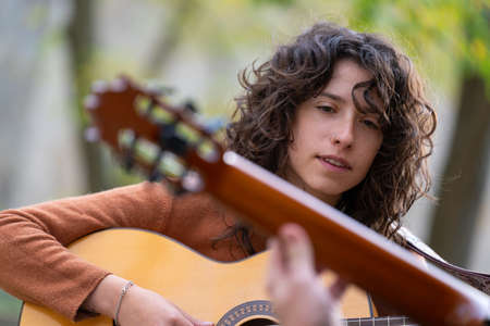 Portrait of handsome teenage boy playing guitar outdoor. Boy using classic guitar. Male alone making music