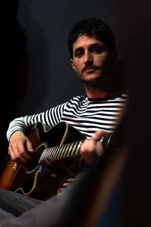A man plays an acoustic guitar in a dark room. Live performance, acoustic concert.