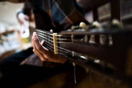 The guitarist plays an acoustic guitar with a capo in front of a microphone. The concept of music recording, rehearsal or live performance.