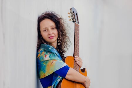 Close view of a beautiful young woman with classic guitar on the streets of the city.