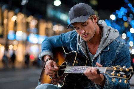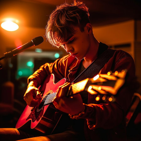 European man skillfully plays an electric guitar, radiating confidence and musical talent