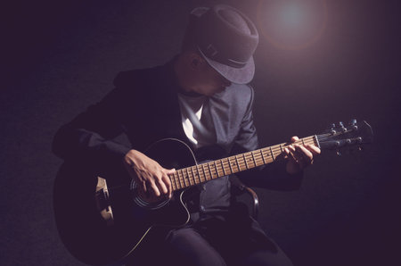Young man playing on acoustic guitar on dark background