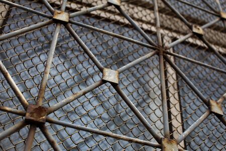 Old rusty metal lattice on a window urban background