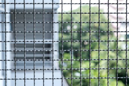 a close-up of the fence from steel mesh with cityscape's background in Ho Chi Minh City, Vietnam