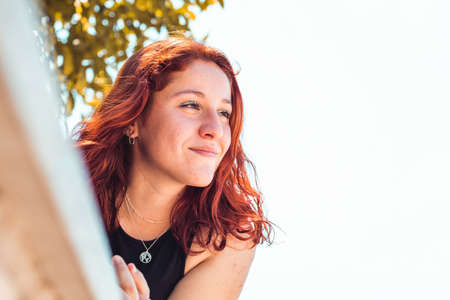 Portrait of a pretty girl with long red hair on a blurred background. Woman portrait without retouching with her natural imperfections