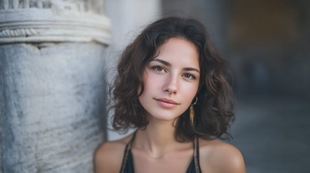 A young woman with curly brown hair and brown eyes poses for a portrait, leaning against a stone column.