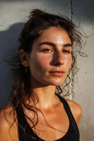 A young woman with dark, curly hair stands facing the camera. Stripes of light and shadow form patterns on the wall. The setting appears urban and modern.